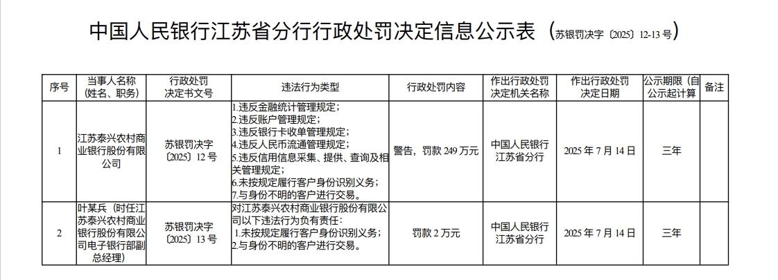 銀行財(cái)眼:江蘇泰興農(nóng)商行因多項(xiàng)違規(guī)被罰款249萬元