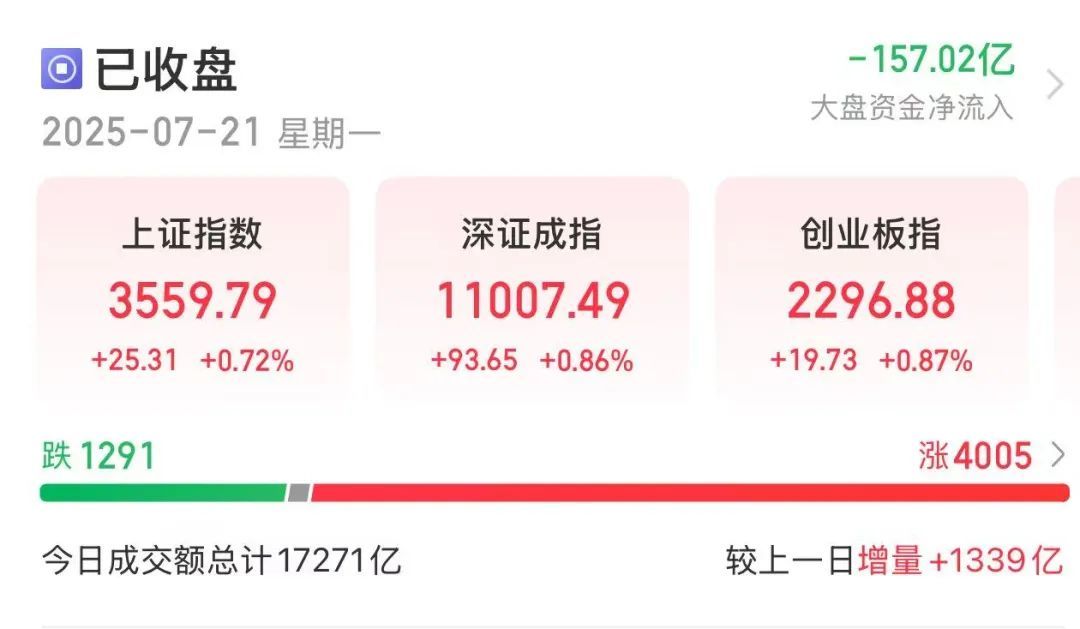 截至收盤,滬指漲0.72%,收獲4連陽并創(chuàng)年內新高;深證成指漲0.86%,創(chuàng)業(yè)板指漲0.87%。全市場成交額約為1.73萬億元,較前一交易日增加1339億元,超4000只個股上漲。