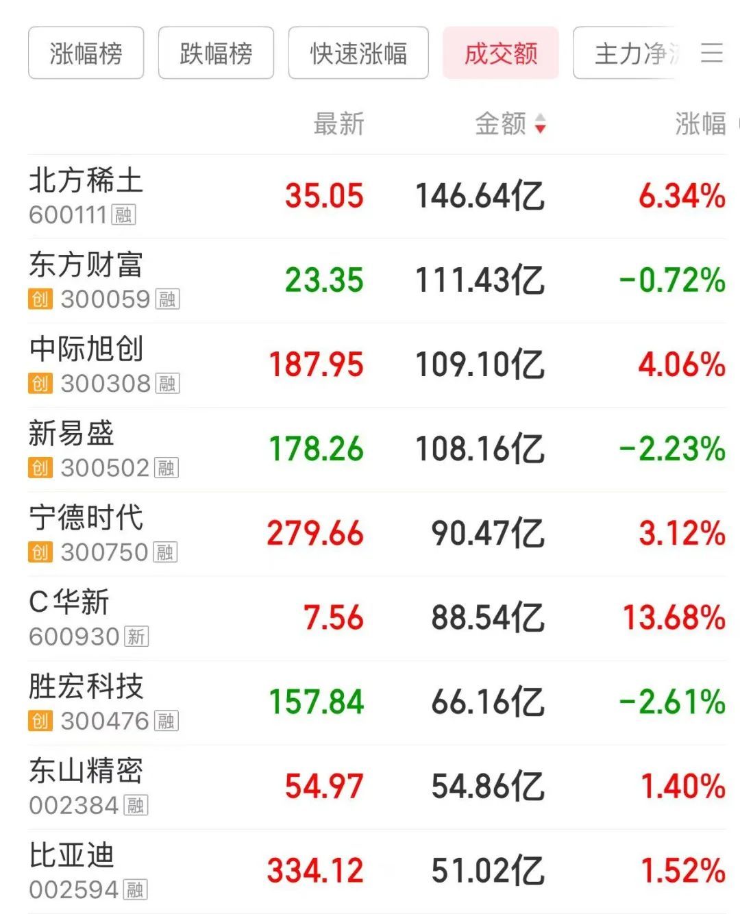 今日盤中,北方稀土(600111)股價一度達到35.75元/股,創(chuàng)下歷史新高。截至收盤,該股成交額為146.64億元,位列A股成交額榜首。今日尾盤,東方財富、中際旭創(chuàng)、新易盛成交額也突破了100億元。