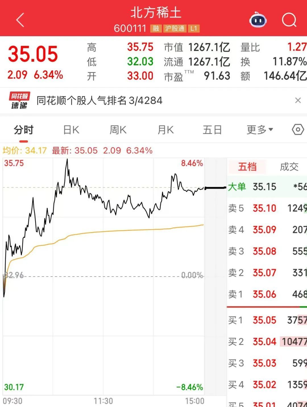 截至今日收盤,北方稀土上漲6.34%,報35.05元/股,成交額為146.64億元,總市值為1267.1億元。