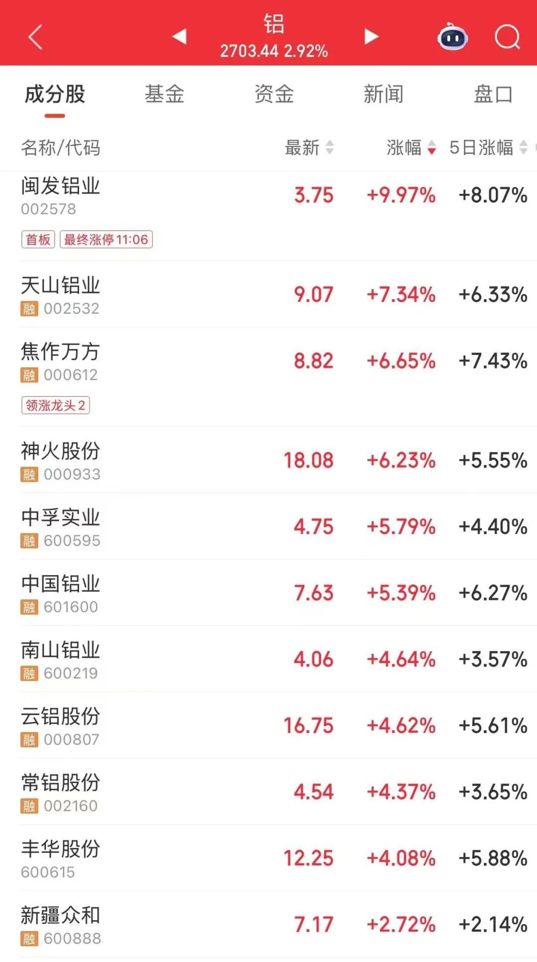 今日午后,鋁板塊異軍突起。天山鋁業(yè)、焦作萬方、神火股份漲幅居前。氧化鋁期貨震蕩走強,截至收盤,上漲8.39%。
