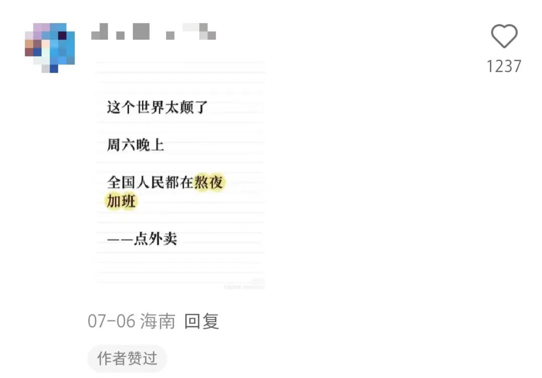 對此,一條點(diǎn)贊超過1000的評論圖寫著:這個(gè)世界太顛了,周六晚上,全國人民都在熬夜加班點(diǎn)外賣。