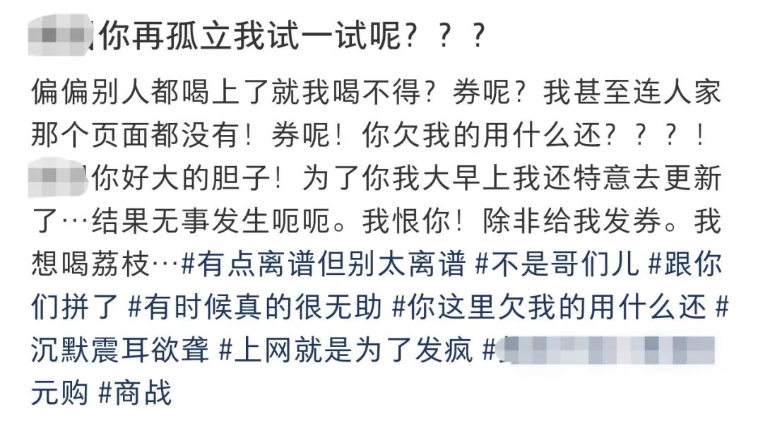 還有網(wǎng)友懷疑自己被“做局”了,直接在社交媒體上“發(fā)瘋”,喊話某平臺:“你再孤立我試一試呢?偏偏別人都喝上了就我喝不得?券呢?我甚至連人家那個(gè)頁面都沒有!券呢?你欠的我的用什么還?”