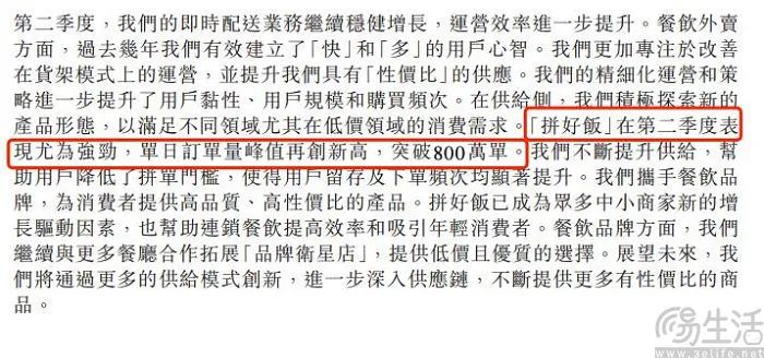 近年來,拼好飯表現(xiàn)出色,單量增長快,為美團帶來了更多下沉市場用戶。美團財報顯示,2024年第二季度拼好飯單日峰值僅800萬,與7月12日的3500萬相差甚遠。