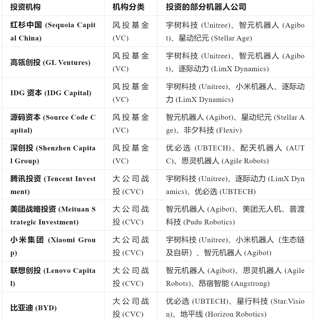 投資方中,紅杉、高瓴、源碼等知名風(fēng)投是機器人領(lǐng)域的主要投資者;騰訊、美團、小米等互聯(lián)網(wǎng)巨頭也不想錯過這波風(fēng)口,雖戰(zhàn)略思考不同,但都紛紛投入資金。