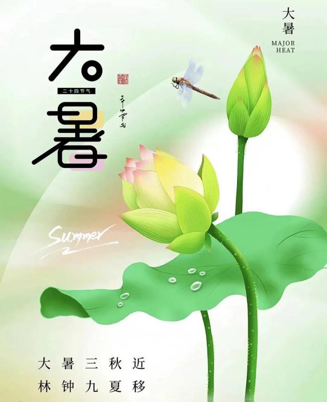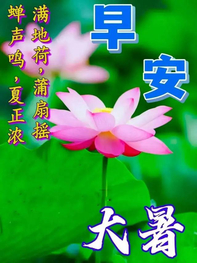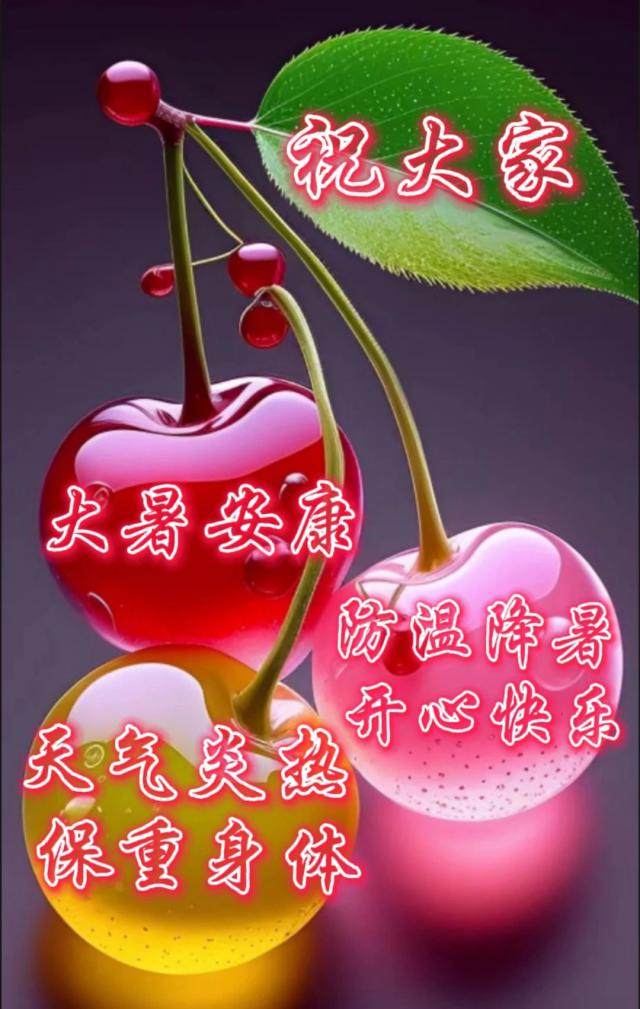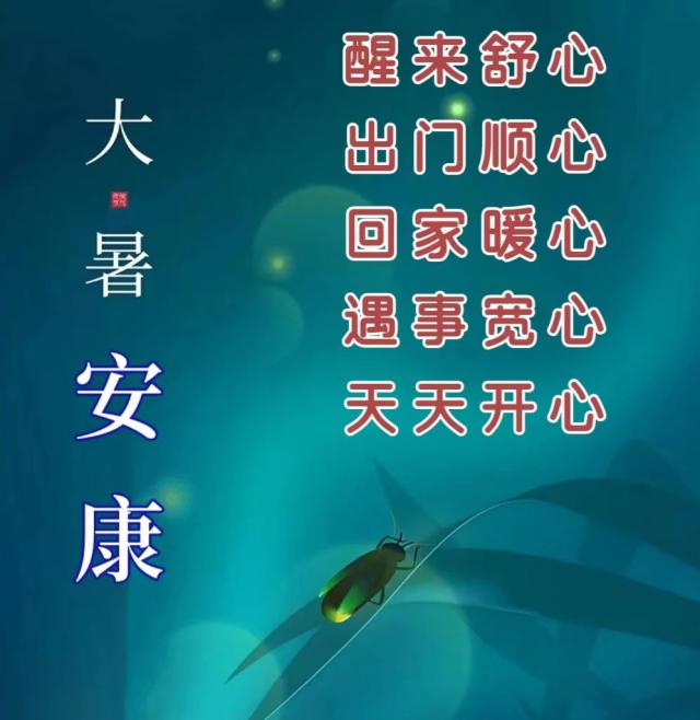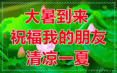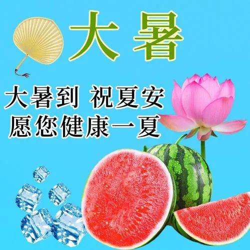 大暑時節(jié)酷熱難耐,防熱避暑很重要。出門記得做好防曬,空調(diào)溫度也要調(diào)節(jié)適當。多吃新鮮的瓜果蔬菜,飲食清淡能美容養(yǎng)顏。流汗多了就喝點鹽水,我真心關懷著你,愿你大暑心情愉悅,清爽健康,幸福安康!