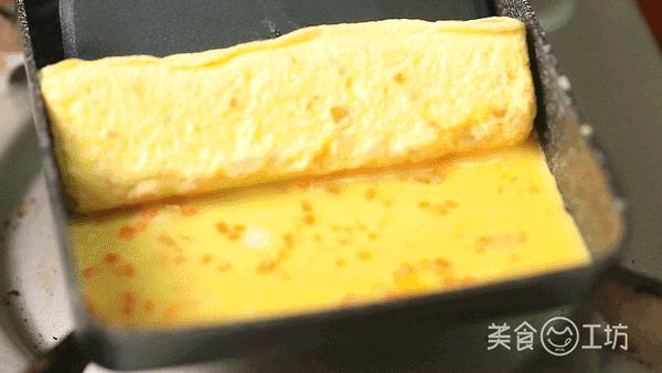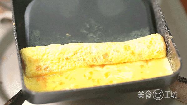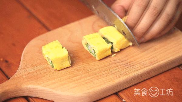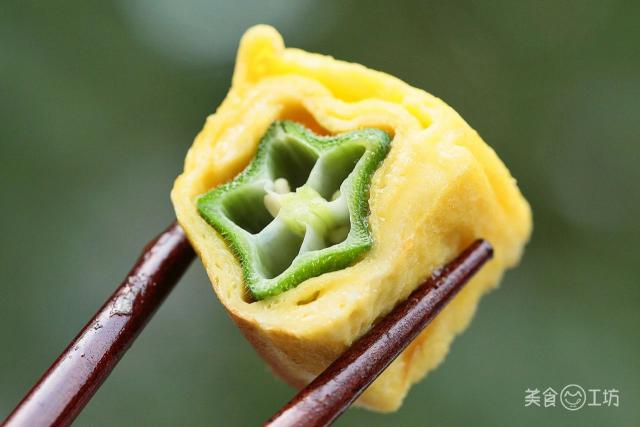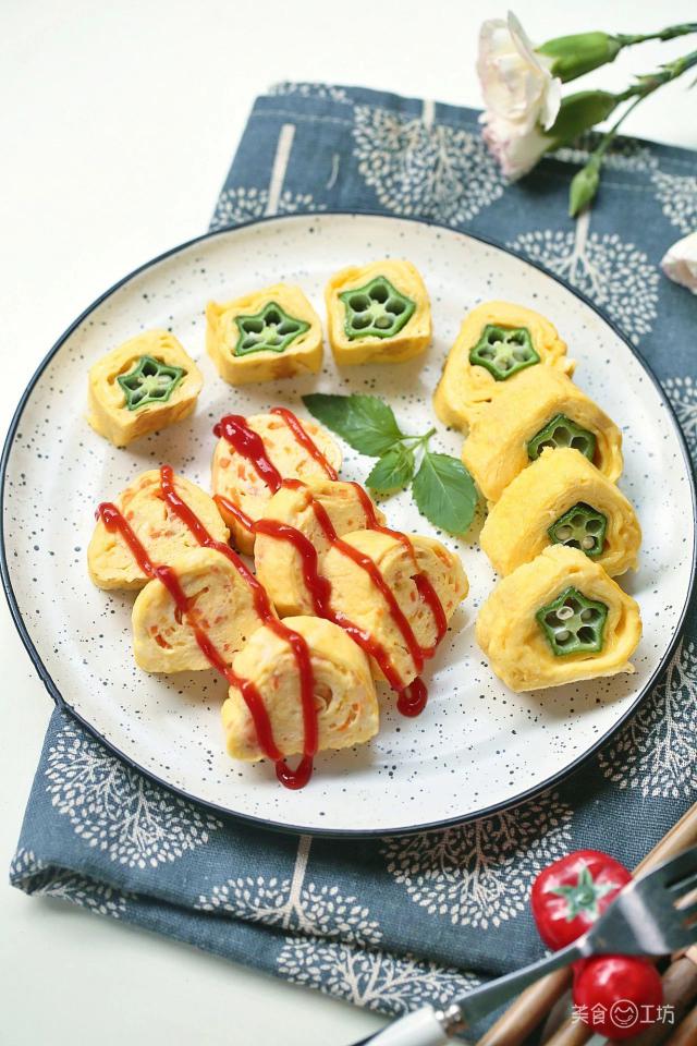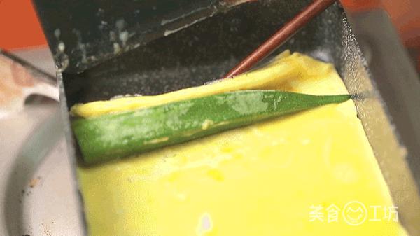 2. 其余步驟和胡蘿卜厚蛋燒相同,在第一次倒入蛋液后,放入秋葵,再卷起即可。