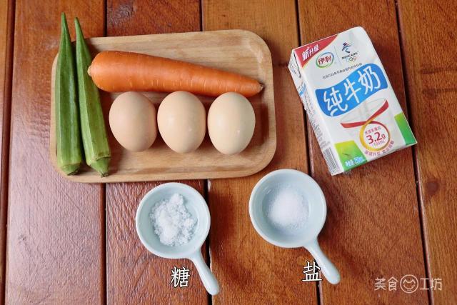 食材:雞蛋、胡蘿卜、秋葵、牛奶、鹽、糖、油