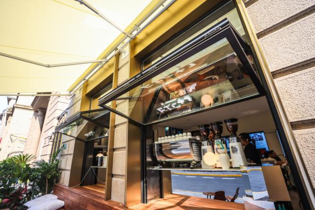 當清晨的第一縷陽光灑下,海關大樓的鐘聲悠悠響起。在其身后的九江路上,一家別具特色的咖啡廳悄然開啟新一天的營業(yè)。四扇巨大的推拉窗緩緩打開,店員搬出柔軟的坐墊,撐起同色系的遮陽傘,熱情地迎接每一位顧客。