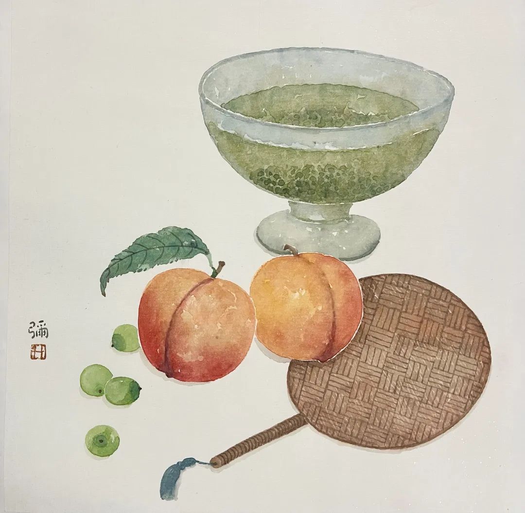 大暑,作為夏季的最后一個(gè)節(jié)氣,攜帶著一年中最為濃烈的暑氣,氣勢磅礴地來臨。大暑時(shí)節(jié)的消夏之趣,隱匿于平凡的煙火生活中。桃子的香氣彌漫四周,扇子的影子輕輕搖曳,一碗綠豆湯便盛滿了大暑獨(dú)有的小確幸。讓燥熱在畫作中漸漸沉淀,化為心底的一抹清寧。借著暑氣的熱烈,尋覓一份自洽的清涼,日子便有了別樣的滋味。