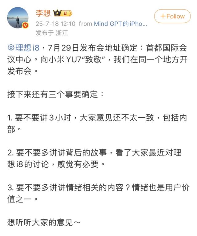 李想本人近期也通過微博征集發(fā)布會的方式以及地點,引發(fā)話題討論,保持線上和線下話題的持續(xù)預熱以及發(fā)酵,不斷拉高用戶的好奇。