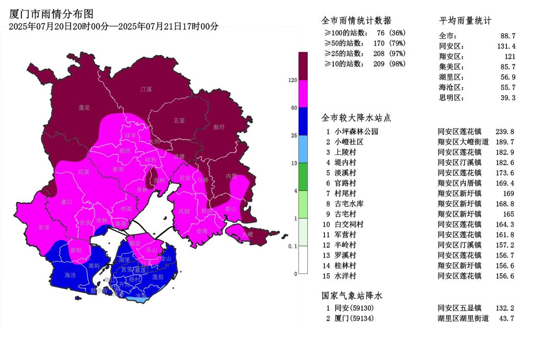 受臺(tái)風(fēng)“韋帕”外圍環(huán)流影響,昨日我市明顯降雨。20日20時(shí) - 21日17時(shí),全市普降大雨到暴雨,局部大暴雨,同安區(qū)小坪森林公園站降雨量達(dá)239.8mm。