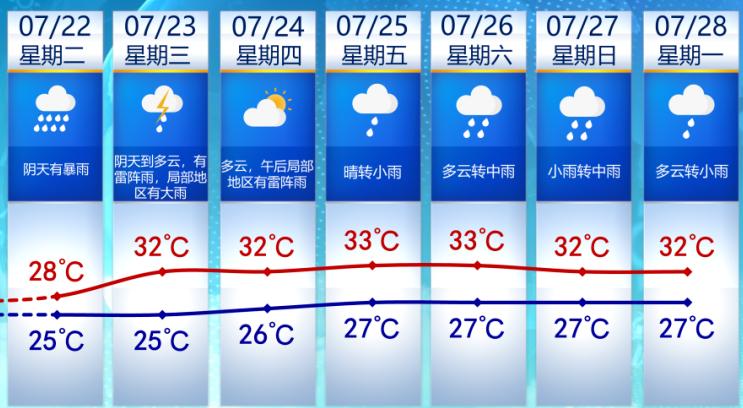 受“韋帕”外圍環(huán)流和熱帶輻合帶影響,今日暴雨持續(xù),到23日降水逐漸減弱。26日 - 30日,多雷陣雨天氣,需防范。