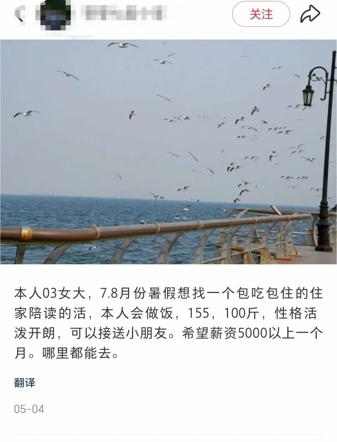 受訪者小芳(化名)在遼寧上大學,暑假時在小紅書上主動發(fā)布求職信息,想找一份包吃包住的住家陪讀工作。她列出自己的優(yōu)勢:會做飯、性格開朗、能接送小朋友,期望月薪五千以上。在她看來,「不用去工廠上班就已經(jīng)很幸?!?,這份工作雖然收入不高,但能讓她發(fā)揮所學、積累經(jīng)驗。