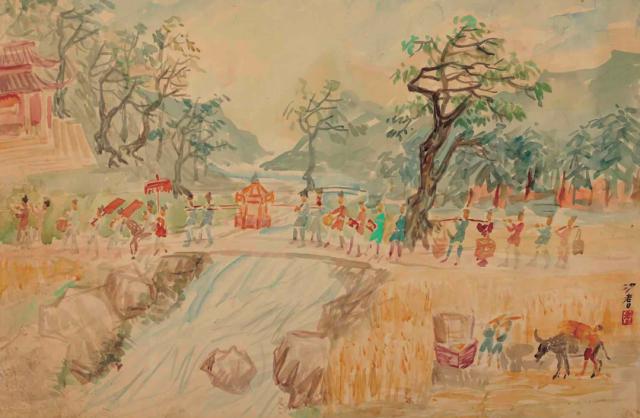 作為舊時鄞縣著名的廟會之一,鄒溪廟稻花會在塘溪老百姓心中的影響力不言而喻。著名畫家沙耆就曾把家鄉(xiāng)的這一盛會繪于紙上。在他的作品中,廟旁有一群人抬著一頂轎子,吹吹打打地經(jīng)過一座橋,溪邊的田里還有幾個人正在辛勤勞作,儼然就是稻花會的生動場景。