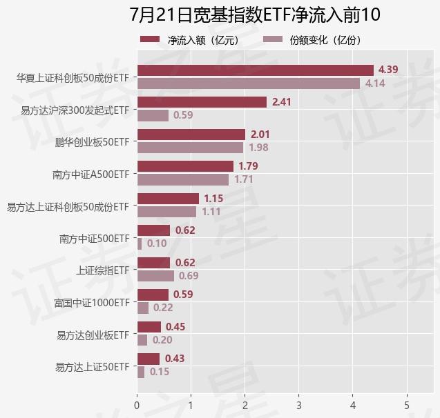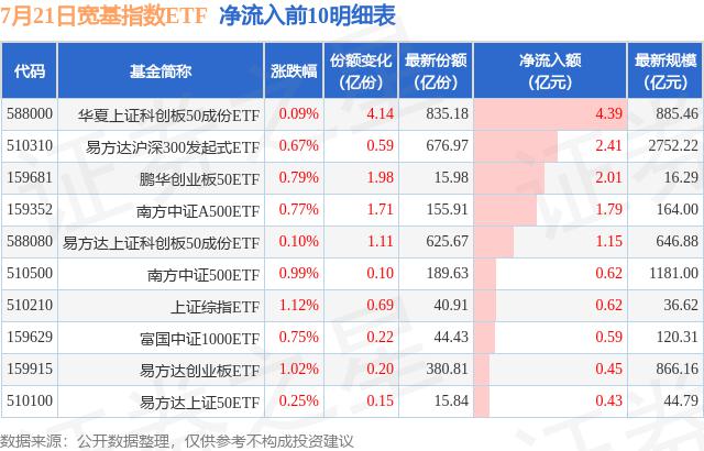 當(dāng)日,有42只寬基指數(shù)ETF基金呈現(xiàn)資金凈流入。其中,華夏上證科創(chuàng)板50成份ETF(588000)凈流入額居首,份額增加了4.14億份,凈流入達(dá)4.39億元。