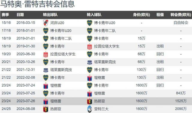 2023年夏窗,雷特吉離開阿根廷,以1525萬歐元轉(zhuǎn)會(huì)費(fèi)加盟意甲熱那亞。那個(gè)賽季,他出場(chǎng)31次,貢獻(xiàn)9球3助攻。僅效力1年,他就以2090萬歐元轉(zhuǎn)會(huì)費(fèi)轉(zhuǎn)投亞特蘭大。上賽季,他出場(chǎng)49次,打入28球并送出9次助攻,其中意甲36場(chǎng)貢獻(xiàn)25球8助攻,成功奪得意甲金靴。
