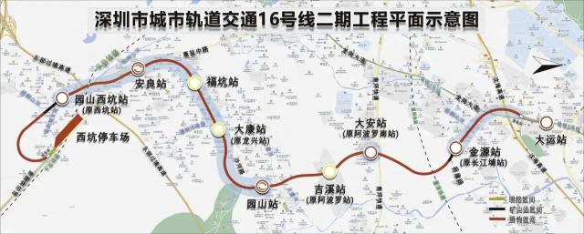 地鐵16號(hào)線二期線路由16號(hào)線一期工程起點(diǎn) 大運(yùn)站 引出,沿龍崗大道、長江埔路、萬福路、公園路、沙荷路、惠鹽中路敷設(shè),終至 園山西坑站。
