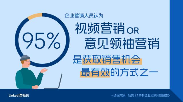 B2B企業(yè)發(fā)布的視頻內(nèi)容更易通過(guò)領(lǐng)英精準(zhǔn)觸達(dá)行業(yè)全渠道受眾,包括潛在客戶(hù)、商業(yè)決策者、合作伙伴和意見(jiàn)領(lǐng)袖等。領(lǐng)英全球調(diào)研數(shù)據(jù)顯示,近95%的企業(yè)營(yíng)銷(xiāo)人員認(rèn)為視頻營(yíng)銷(xiāo)或意見(jiàn)領(lǐng)袖營(yíng)銷(xiāo)是獲取銷(xiāo)售機(jī)會(huì)的有效方式之一。