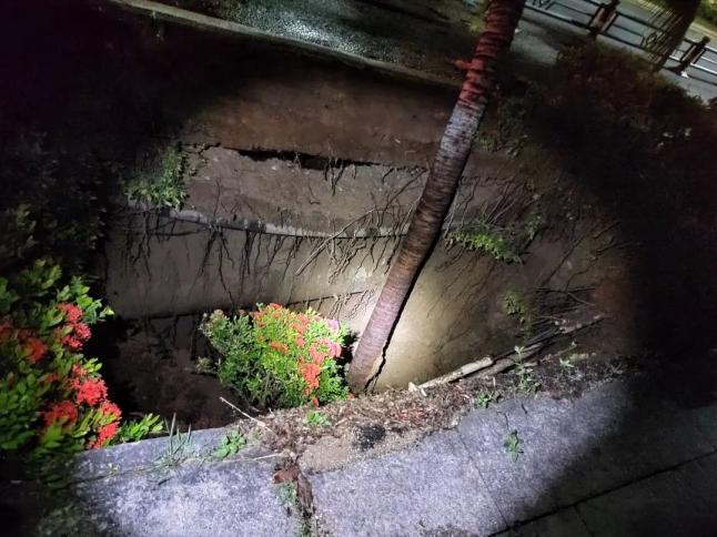 受持續(xù)強(qiáng)降雨影響,昌江縣石碌鎮(zhèn)人民北路皇朝路口往太坡方向一處路面塌陷,致使該路段交通中斷,車輛和行人無法通行。