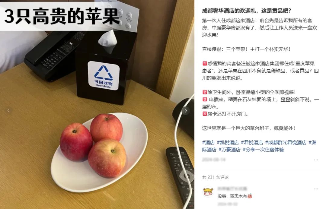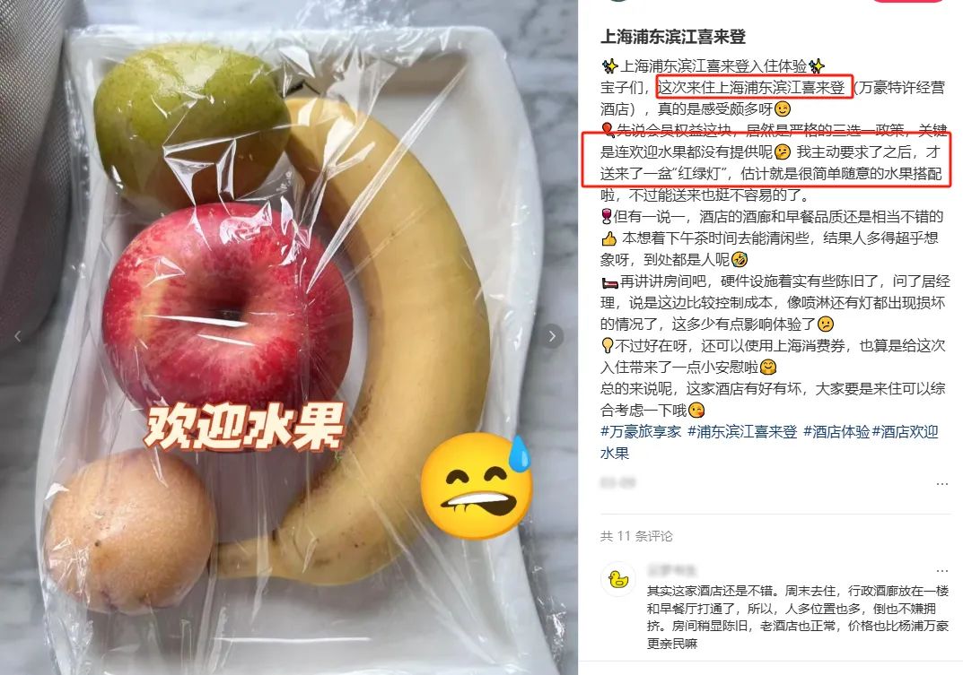 酒店的歡迎水果,本意是展示服務(wù)和體現(xiàn)會(huì)員權(quán)益。但在降本增效的大背景下,很多歡迎水果成了客人入住酒店后第一個(gè)吐槽的焦點(diǎn)。