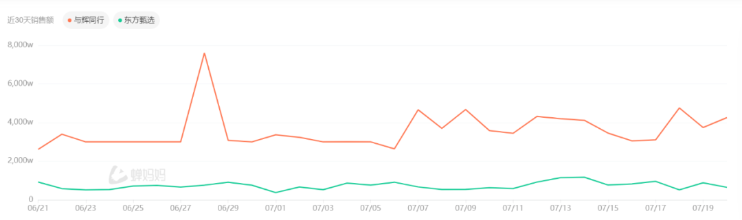 在粉絲數(shù)量上,截至7月中旬,與輝同行已經(jīng)突破3000萬大關,東方甄選落后一截,粉絲數(shù)仍在2800W左右徘徊。蟬媽媽數(shù)據(jù)顯示,在直播觀看方面,在近30天(6月21日至7月20日)中,與輝同行直播日均觀看1573.7W,東方甄選僅384.3W;而在銷售額趨勢對比中,盡管與輝同行出現(xiàn)大幅下降,但仍在東方甄選之上。也就是說,在粉絲、觀看與銷售額上,由董宇輝主導的與輝同行占據(jù)明顯優(yōu)勢。