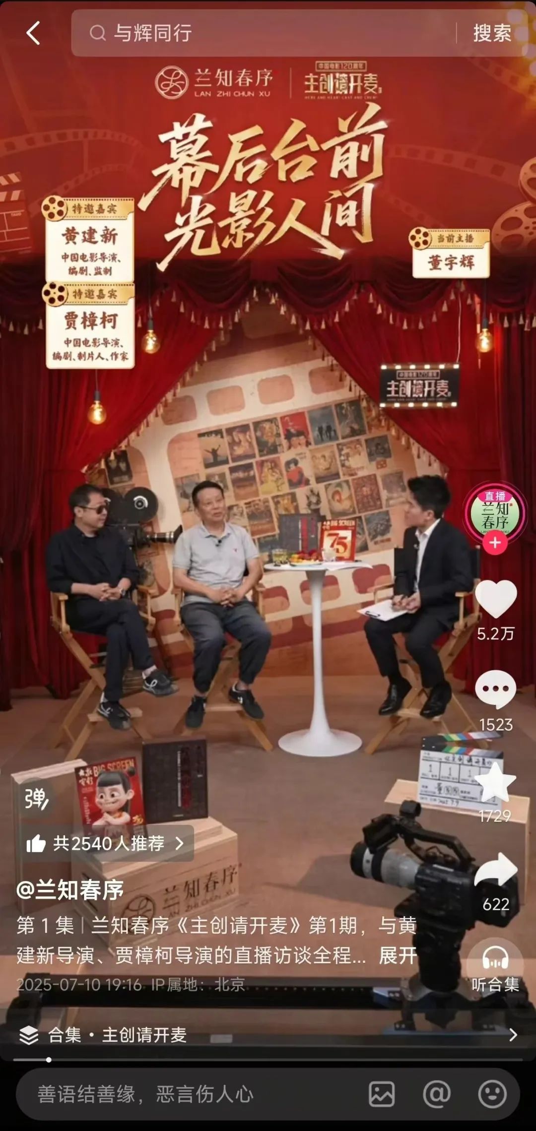 但在“內(nèi)容”這條路徑上,董宇輝動作不斷。7月3日,他開通新賬號“蘭知春序”,聚焦文化和旅游領域,一周吸粉150萬;9日,該賬號推出全新欄目《主創(chuàng)請開麥》,由董宇輝對話黃建新、賈樟柯導演,聚焦中國電影的幕后臺前。