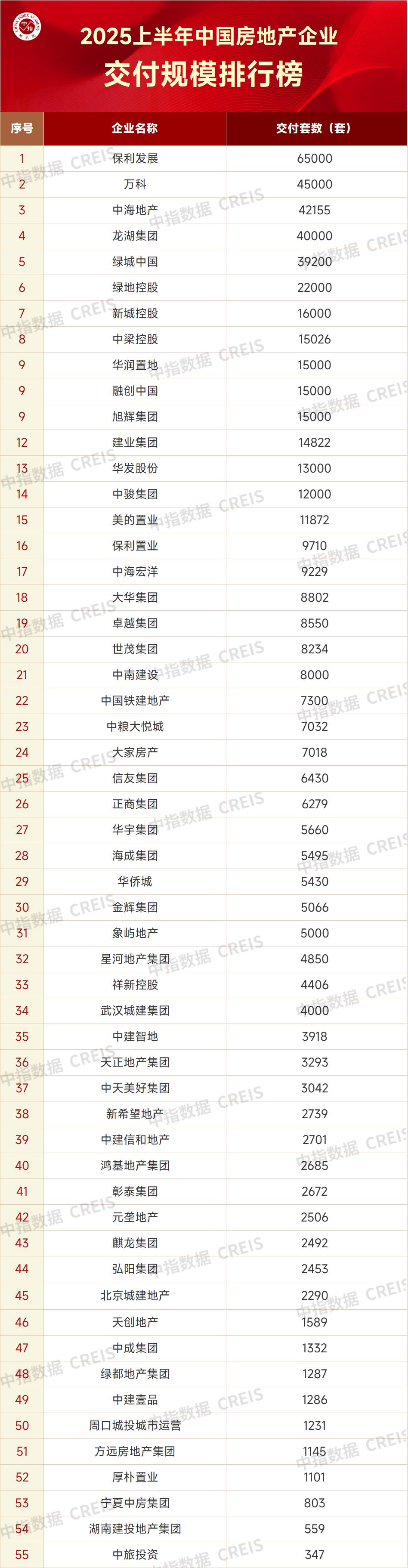 2025年上半年,“好城市 + 好房子”支撐新房市場整體保持平穩(wěn)。一季度市場延續(xù)修復態(tài)勢,但二季度有所轉(zhuǎn)弱。6月13日國常會提出要采取多種措施穩(wěn)定預期、激活需求、優(yōu)化供給、化解風險,更大力度推動房地產(chǎn)市場止跌回穩(wěn),這釋放了積極信號,預計下半年各級政府將全力推動已出臺政策落地見效。當前居民收入、房價預期以及市場優(yōu)質(zhì)供給仍偏弱,重點城市中二手房對新房的“替代效應”明顯,預計下半年新房市場仍將波動調(diào)整,市場分化持續(xù),“好城市 + 好房子”仍有結(jié)構(gòu)性機會。在房地產(chǎn)市場加速分化和回歸居住屬性的背景下,交付成為房企經(jīng)營的重要環(huán)節(jié),房企的交付力不僅是社會責任的擔當,更是產(chǎn)品力和競爭力的深層次體現(xiàn),是立足長期主義穿越長周期的關(guān)鍵。從交付規(guī)模來看,2025年上半年交付高峰已過,交付規(guī)模下滑,保交付壓力減輕。全國竣工數(shù)據(jù)顯示,2025年房屋竣工面積22567萬平方米,下降14.8%,其中住宅竣工面積16266萬平方米,下降15.5%。2022 - 2024年,住宅竣工面積有起有伏,2024年以來,隨著前期銷售逐漸竣工結(jié)轉(zhuǎn),銷售額下滑,竣工結(jié)轉(zhuǎn)面積呈下降態(tài)勢。從企業(yè)交付套數(shù)來看,2025年上半年,1家企業(yè)交付套數(shù)超五萬套,15家企業(yè)交付套數(shù)超萬套。與上年同期相比,企業(yè)交付套數(shù)普遍下降,綠地、融創(chuàng)、建業(yè)等交付規(guī)模下降超50%。隨著交付壓力減輕,企業(yè)可能重啟經(jīng)營活動。從企業(yè)交付情況來看,部分企業(yè)實現(xiàn)了提前交付。如上海中海海上和集項目創(chuàng)新“社交式交付”,提前6個月兌現(xiàn);中海宏洋的丹陽臻如府項目多次獲獎,小區(qū)一二期近580戶均提前交付,交房即發(fā)證;上海大華錦宸府提前170天高品質(zhì)交付;2025年上半年,海成集團住宅交付5495套,近八成實現(xiàn)“交付即交證”;武漢城建·江山云曉項目提前3個月交付,推行“交付即辦證”模式;新希望地產(chǎn)的武漢D10天元首批次提前120天交付,二批次提前60天;彰泰集團14個項目如期兌現(xiàn)品質(zhì)承諾,部分項目實現(xiàn)“交付即交證”;周口城投如意府提前180天交付;寧夏中房璽悅臺項目東區(qū)提前120天交付。產(chǎn)品落地和優(yōu)化服務