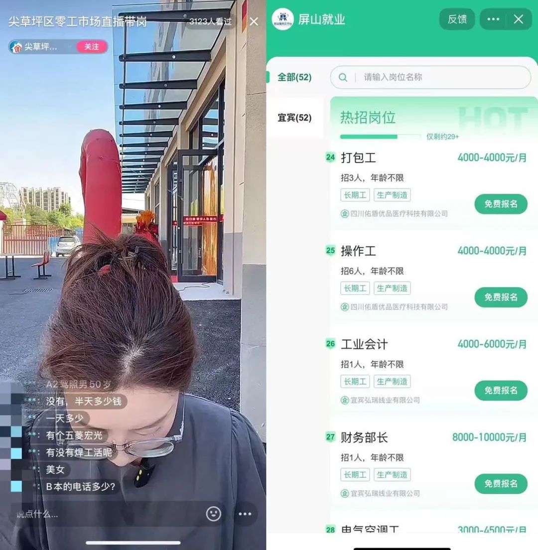 鏡頭前,主播拿著招聘海報(bào)熱情地吆喝著;屏幕另一端,求職者在評論區(qū)急切地詢問崗位細(xì)節(jié)。