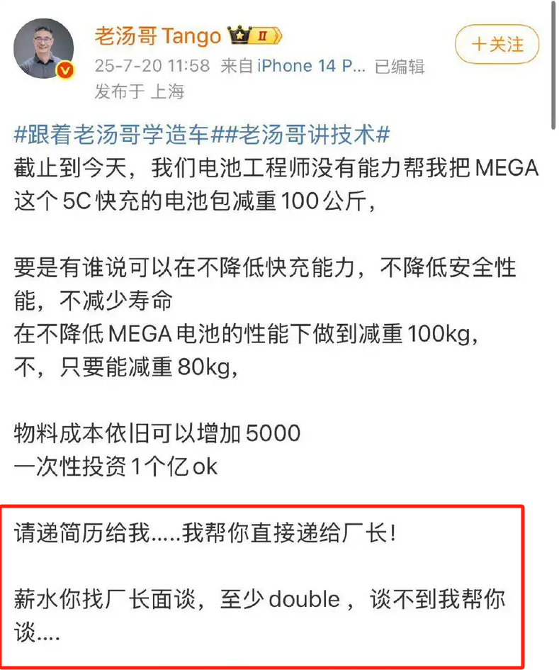 老湯哥稱:“我們電池工程師沒辦法幫我把MEGA這個5C快充的電池包減重100公斤。要是有誰能在不降低快充能力、安全性能和電池壽命,不降低MEGA電池性能的前提下,做到減重80kg,物料成本可以增加5000,一次性投資1個億也沒問題。請把簡歷遞給我,我?guī)湍阒苯舆f給廠長!薪水你和廠長面談,至少double,談不攏我?guī)湍阏劇!?/p>
