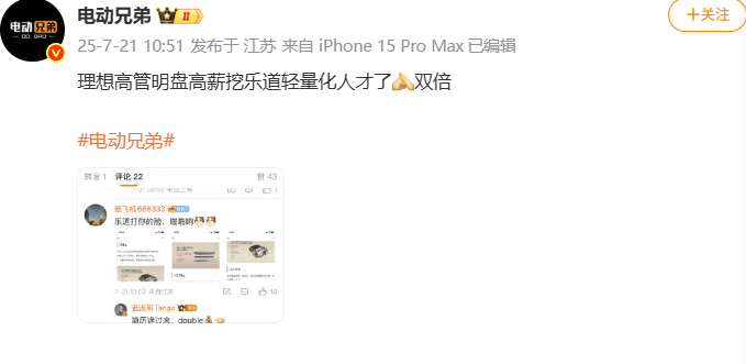 7月21日,有汽車博主爆料,理想高管以雙倍高薪挖取樂道汽車(蔚來旗下子品牌)的輕量化人才。