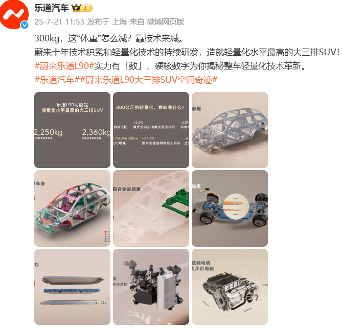 7月21日,樂道汽車發(fā)布了《300kg,這“體重”怎么減?》一文,詳細解讀其輕量化技術。文中提到,樂道L90的車身輕量化系數為2.12,白車身重量僅433.8kg,相比同級別的增程車型優(yōu)化了約20%。此外,全新一代輕量化電池包容量為85kWh,總重量僅440kg,能量密度達到193.2Wh/kg,領先行業(yè)平均水平26%。文章還對更多輕量化技術進行了解讀,特別強調“既懂輕量化,也懂增重”,列舉了大量L90的配置細節(jié)。