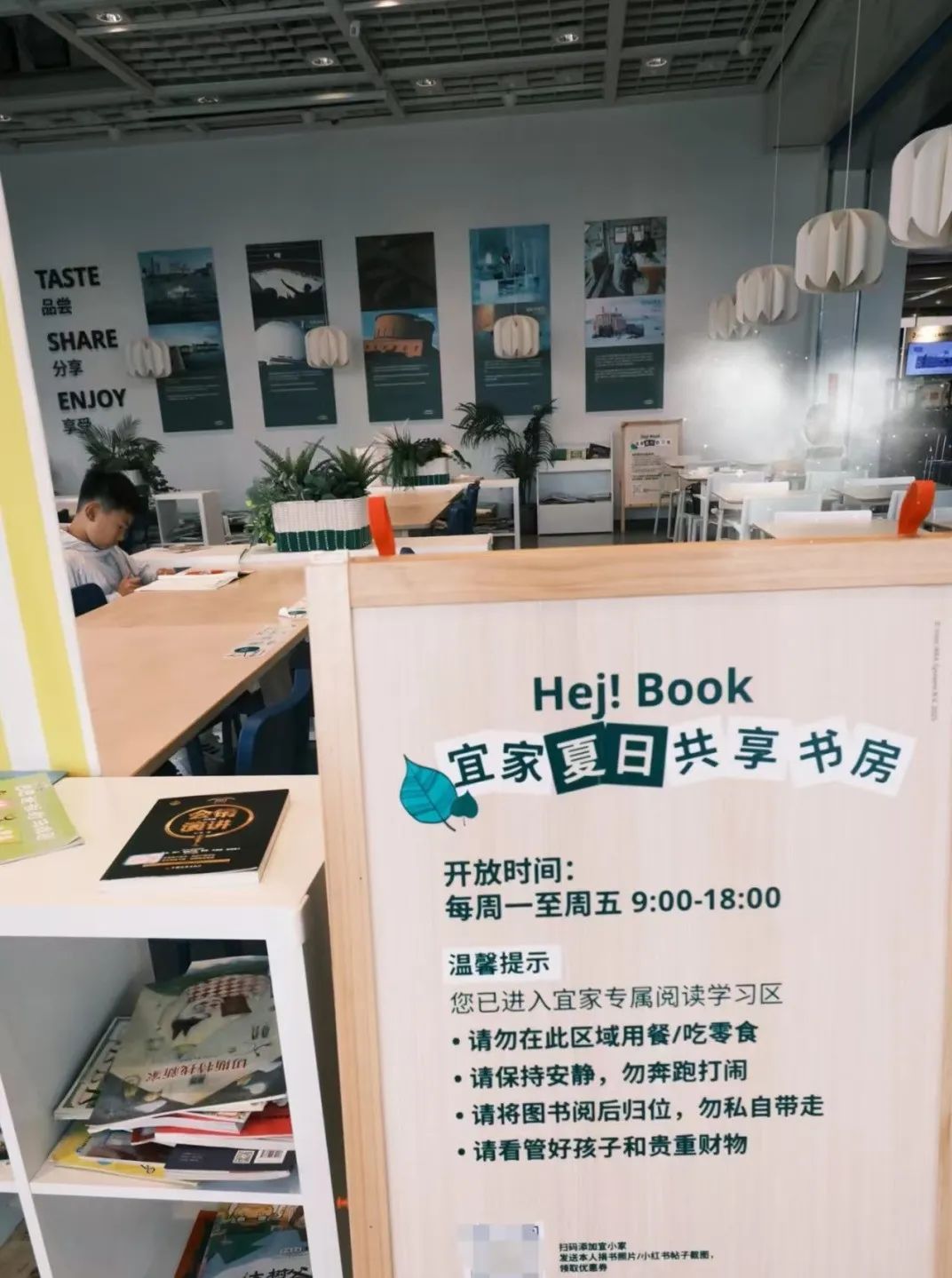 宜家也在這個(gè)夏天開(kāi)放了自習(xí)室。從7月1日到8月31日的暑期,徐州宜家在三樓餐廳單獨(dú)劃出一塊區(qū)域,作為“宜家夏日共享書(shū)房(Hej!Book)”。每周一至周五的9點(diǎn) - 18點(diǎn),這里提供書(shū)籍,免費(fèi)開(kāi)放給孩子們看書(shū)、寫(xiě)作業(yè),孩子們還能參與共享圖書(shū)活動(dòng),進(jìn)行書(shū)籍互換。