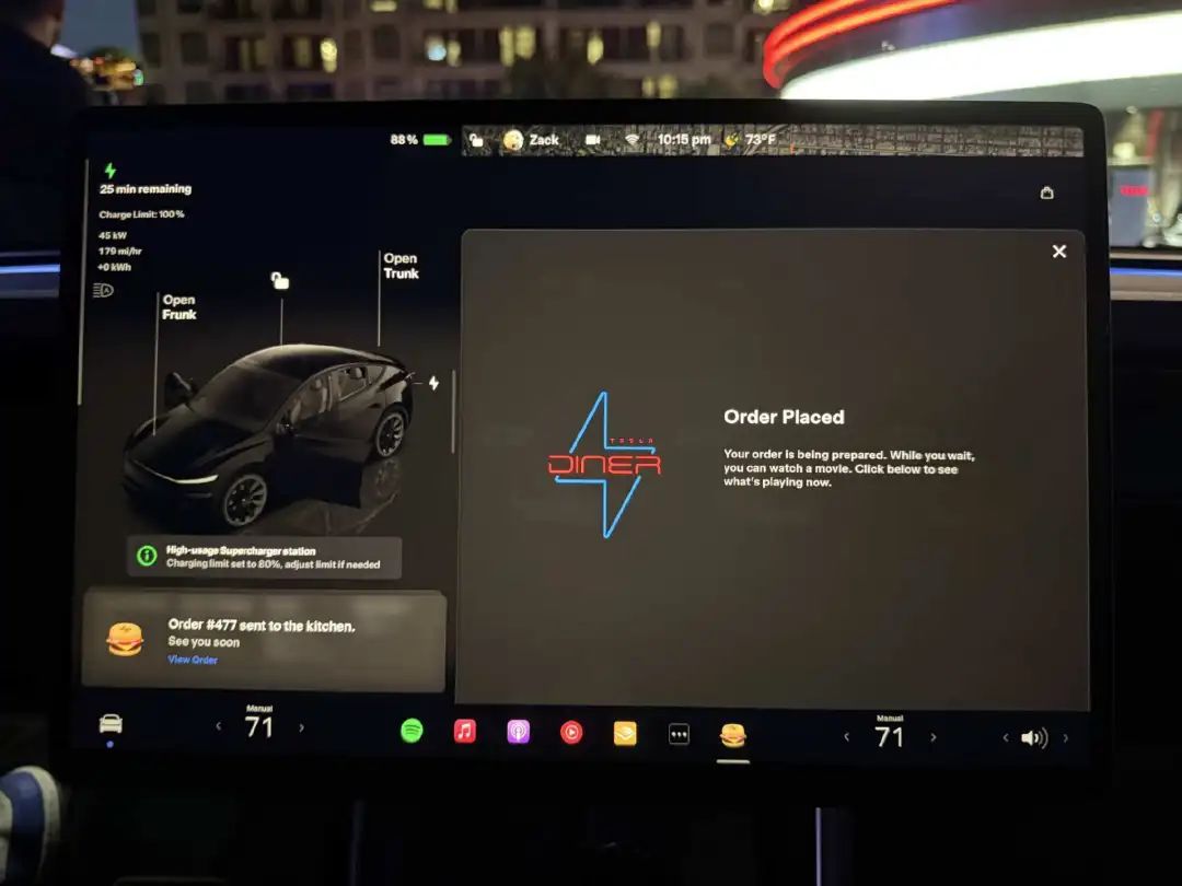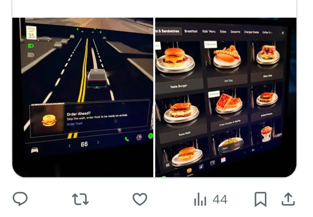 開車導(dǎo)航到餐廳時,車機界面會出現(xiàn)通知,詢問是否提前訂購食物,并顯示完整菜單。車輛距餐廳15至20分鐘車程時,廚房自動準(zhǔn)備餐點。抵達后可選擇車內(nèi)送餐或入店用餐。