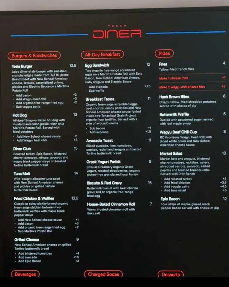 開設(shè)這家餐廳的想法源于2018年馬斯克在推特上的奇思妙想:“在超級充電站旁開一家能吃飯、看電影、體驗未來的餐廳,建一間‘老派滑輪 + 搖滾音樂風(fēng)格的Drive - In餐廳’。