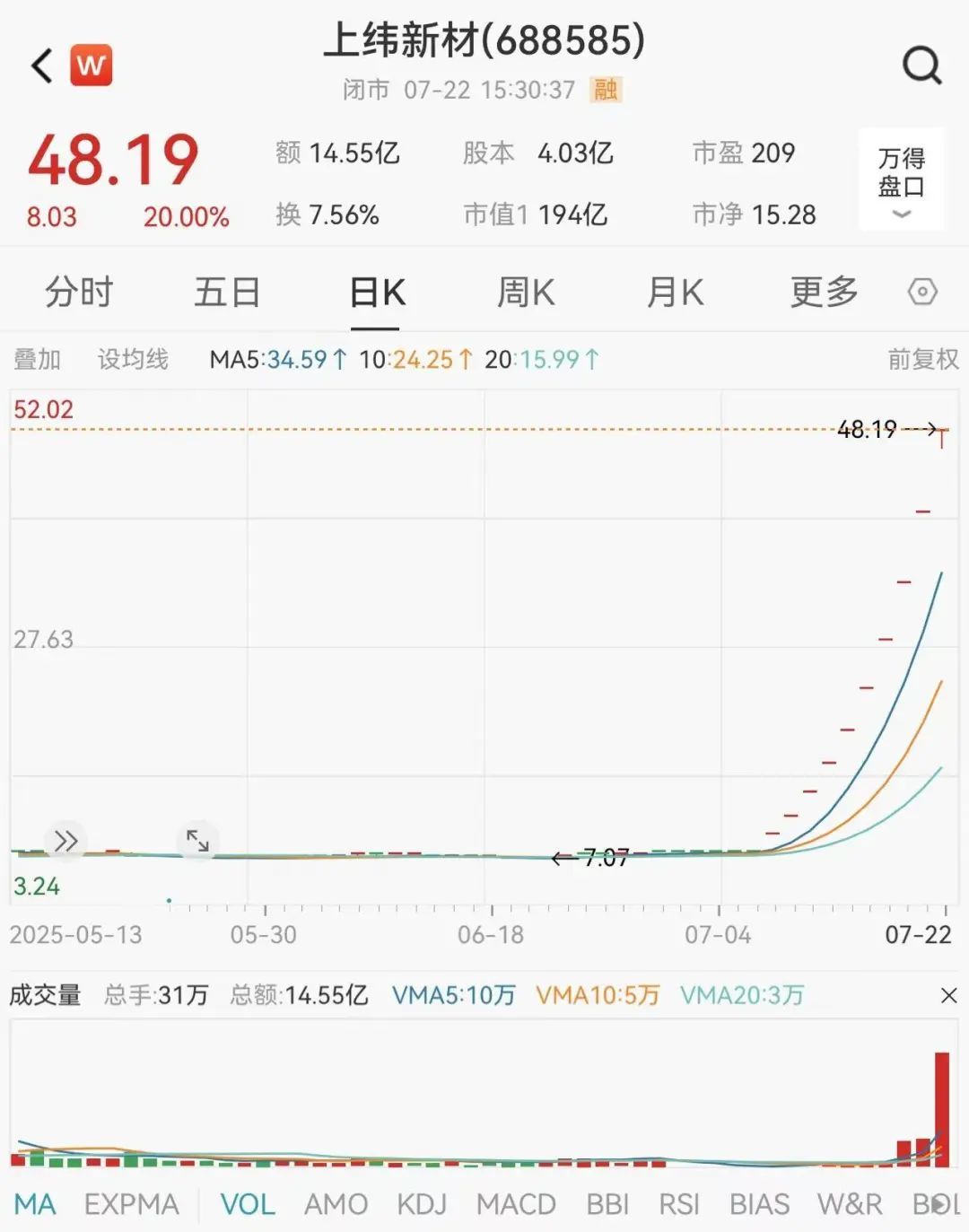 上緯新材已連續(xù)10個(gè)交易日漲停,累計(jì)漲幅超519%,成交超14億元,刷新了A股“20cm”個(gè)股的連板紀(jì)錄。