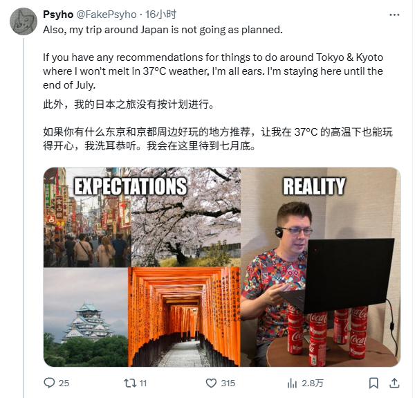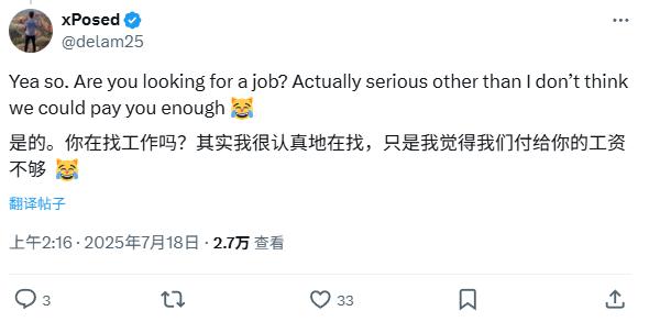這位選手和柯潔一樣“個性”。當(dāng)大家好奇這么強的程序員在哪工作時,翻開他的簡介會看到:“我退休了,整個生活都是假期?!北荣惤Y(jié)束后他還在東京,網(wǎng)友建議他去徒步旅行,他回應(yīng)說:“什么地方能讓我在37度還玩得開心,說來聽聽?!边€配了張圖。很多人向他拋出橄欖枝,問他缺不缺工作,他果斷回應(yīng):“我很好,不喜歡上班,除了作為人類的最后一道防線。(流汗黃豆)”