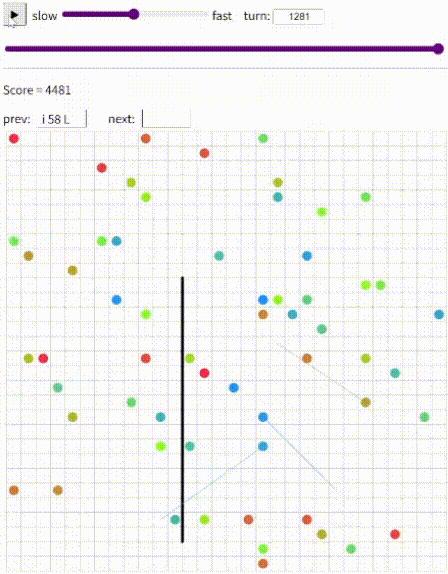 這場比賽過程可謂一波三折。比賽規(guī)則是只有一道題,誰編的算法最優(yōu)就能贏,時間為十個小時。題目是選手要扮演指揮官,在一片區(qū)域里,通過設(shè)計策略,高效地指揮每個機器人士兵移動到它們的目的地。由于機器人數(shù)量多,且每個機器人有固定的移動規(guī)則,容易出現(xiàn)堵車情況,所以選手要盡可能找到最優(yōu)規(guī)劃,讓機器人少繞路。區(qū)域中間還有一堵墻會阻擋機器人前進(jìn),選手也可以建起自己的墻,利用墻卡走位,能讓機器人更容易走到指定位置。這種問題有無限可能,在有限時間里很難找到最優(yōu)解,參賽選手只能比拼誰的優(yōu)化更好。