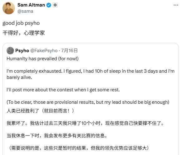 比賽中,AI一上場就把所有人類選手壓著打,其他人難以招架。但有一位叫Psyho的波蘭選手頂住了壓力,最終獲得冠軍,AI屈居第二。人類選手Psyho獲勝的那一刻,網(wǎng)友們像壓抑到極致后瞬間燃爆,紛紛到Psyho的社交軟件下留言,稱贊他是英雄,甚至奧特曼也親自向他祝賀。