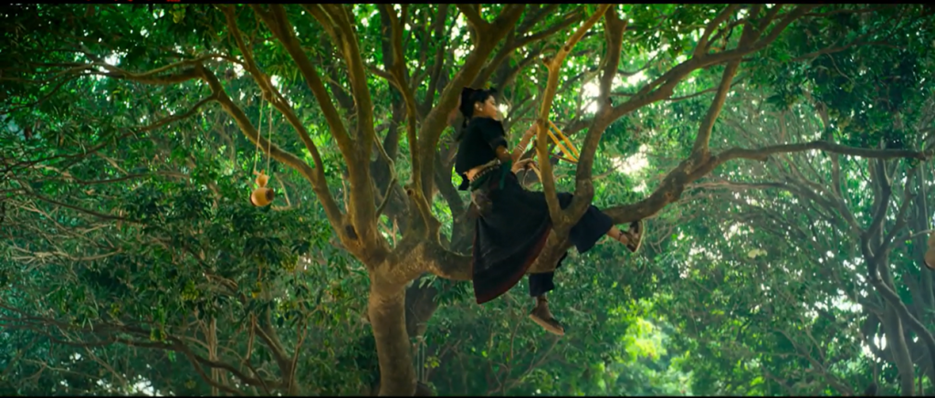 李善德初到嶺南,被當(dāng)?shù)禺愑蚯檎{(diào)震撼。手藝人繩上的猿猴、彩色掛布的大象、籠中的鴕鳥、何節(jié)帥豢養(yǎng)的黑熊,增添喜劇風(fēng)味,也彰顯嶺南邊地人的原始獸性。阿僮在荔枝園靈活穿梭,林邑奴人的經(jīng)典動(dòng)作戲,展現(xiàn)他們的原始本能。邊地人畜混居,但在人心感化下,原始獸性漸漸展現(xiàn)出人性光輝。