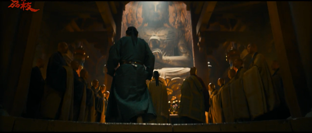 上位者的冷酷通過神佛之性體現(xiàn)。招福寺巨大鎏金坐佛下,楊國忠登場,佛像低眉俯視眾生,無悲無喜,象征無情。