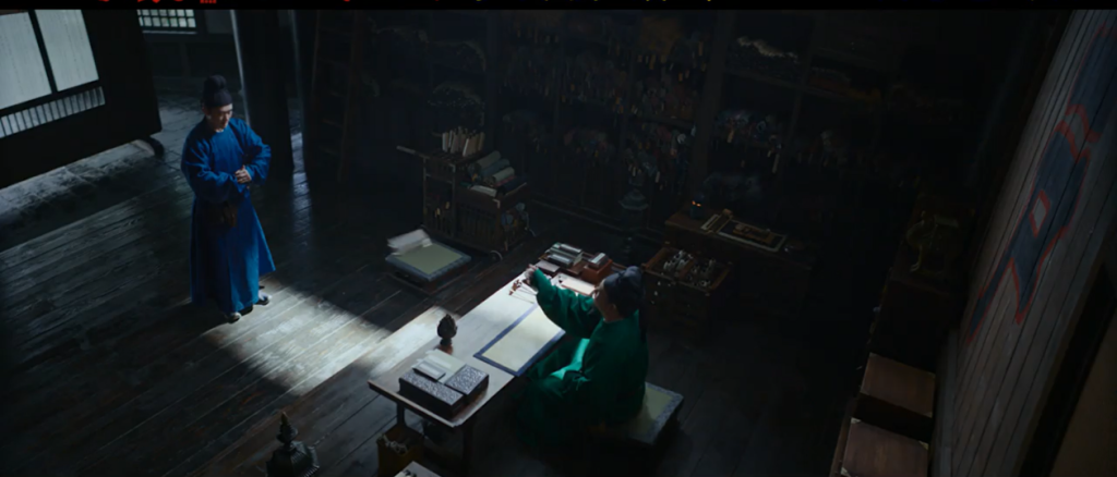 影片對(duì)光影的運(yùn)用很有心思。前期李善德在署地不得志,導(dǎo)演用從狹長窗格透進(jìn)來的一絲光亮作側(cè)光,營造府衙壓抑氛圍,烘托人物心理。李善德奉旨回署后,全開間的陽光一掃暗影,光影轉(zhuǎn)換暗示他從忍氣吞聲到揚(yáng)眉吐氣。