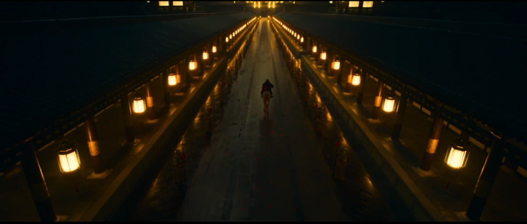 影片結(jié)尾,李善德騎白馬從長安黑夜中出現(xiàn),經(jīng)過燈火通明的長街,紅色宮門打開,強(qiáng)光后荔枝出現(xiàn)在畫面中心,內(nèi)宦環(huán)繞,舞姬嬌嗔,奢華場景與先前緊張激烈形成鮮明對(duì)比?!昂尾皇忱笾Α钡纳菝液汀耙或T紅塵”的悲哀,在光影更替中被襯托得淋漓盡致。