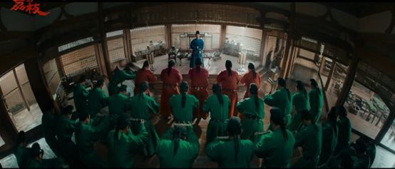 影片多處用環(huán)繞鏡頭展現(xiàn)主人公深陷困境的窘態(tài)。上林署的酒宴、荔枝園被砍伐的群戲,都體現(xiàn)了李善德的無力感。向中心收攝的半圓形構(gòu)圖反復(fù)用來表現(xiàn)權(quán)力的向心結(jié)構(gòu)。魚朝恩到上林署、千佛閣中右相和李善德對(duì)峙,官員跪成一圈,這種“全景敞視”的半圓形構(gòu)造是權(quán)力規(guī)訓(xùn)和獲取最大效益的視角呈現(xiàn)。
