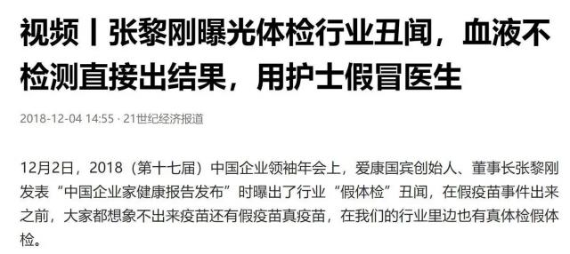 最諷刺的是,愛康國賓的創(chuàng)始人張黎剛先生,2018 年曾振臂高呼,炮轟行業(yè)亂象。他說:“行業(yè)里有真體檢、假體檢,有些同行抽了血不做檢查,倒掉血直接給結(jié)果?!边€說“用護(hù)士假冒醫(yī)生做超聲檢查”。