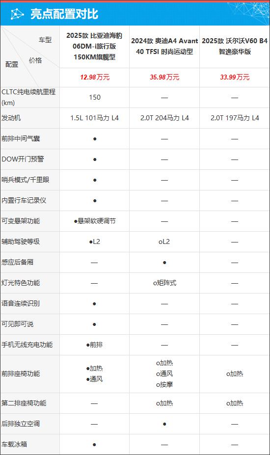 具體到車(chē)輛配置層面,通過(guò)對(duì)比可知,比亞迪海豹06DM - i旅行版雖然售價(jià)最低,但配置卻遙遙領(lǐng)先。它獨(dú)享前排中間氣囊、哨兵模式 / 千里眼、懸架軟硬調(diào)節(jié)、前排手機(jī)無(wú)線(xiàn)充電功能、車(chē)載冰箱等,用車(chē)體驗(yàn)更加出色。奧迪A4整體表現(xiàn)也還不錯(cuò),不過(guò)部分亮點(diǎn)配置需要選裝,如矩陣式大燈、前排座椅加熱、通風(fēng)和按摩等。相比之下,沃爾沃V60的配置表現(xiàn)一般。