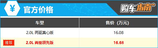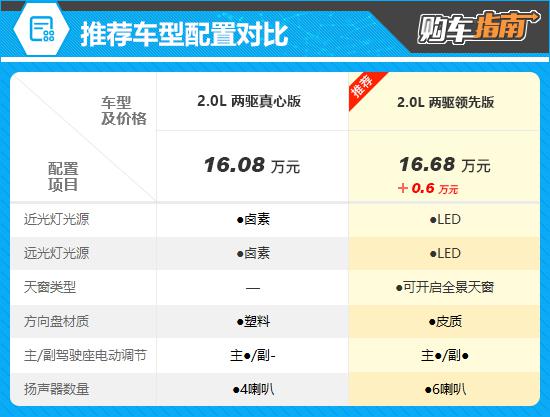 推薦車型是2.0L兩驅(qū)領(lǐng)先版,售價(jià)16.68萬(wàn)元。和低一個(gè)配置的車型相比,雖然差價(jià)只有0.6萬(wàn)元,但配置提升很值得。具體來(lái)說(shuō),推薦車型不僅升級(jí)了LED大燈、皮質(zhì)方向盤和6喇叭揚(yáng)聲器,還新增了可開(kāi)啟全景天窗和副駕駛座電動(dòng)調(diào)節(jié),整體表現(xiàn)不錯(cuò)。