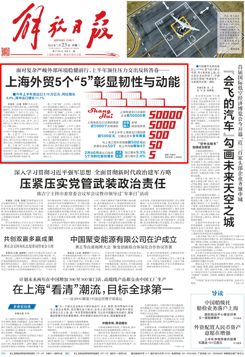 第五個是“50000”。上半年,上海有進出口記錄的企業(yè)超過5萬家,其中既有規(guī)模超百億元的大型企業(yè),也有大量小微企業(yè),它們共同為上海外貿(mào)注入了強勁動力。