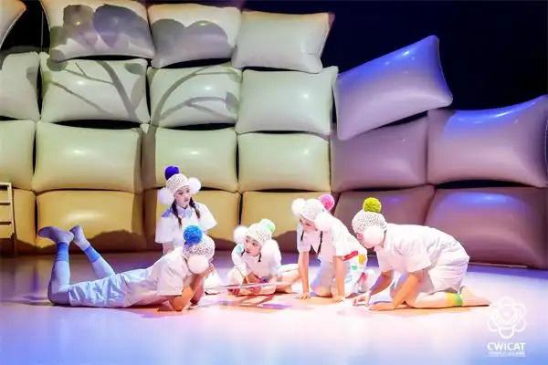 《萬物都在變》取材于繪本讀物,完全采用抽象偶形,通過形狀、色彩和音樂的變換,表現(xiàn)生命的成長與蛻變。這種更具想象力的嘗試挑戰(zhàn)了傳統(tǒng)偶戲的敘事方式,卻意外獲得小觀眾喜愛。該劇借用現(xiàn)代舞形式,配合多變偶形、疊加放大的道具和抒情音樂,吸引了小觀眾的目光。這引發(fā)我們思考:在保持偶戲本質(zhì)的前提下,抽象表達(dá)是否會(huì)成為未來發(fā)展的新方向?
