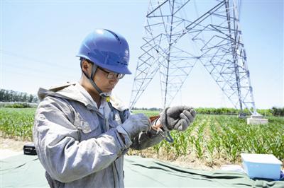付明戴著紅色安全帽介紹:“現(xiàn)在采用無人機(jī)和電動升降裝置協(xié)助作業(yè),效率比以前提高很多?!贝舜纬霈F(xiàn)問題的500千伏河橋二線點位周邊是莊稼地,高壓電塔矗立在農(nóng)田間,部分收割后的農(nóng)田在烈日下反光,高壓輸電線下方是身著整齊制服的輸電工作人員。
